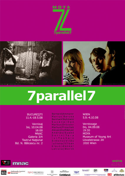 Muzeul National de Arta Contemporana in colaborare cu Museum of Young Art, Viena si Anaid Art Gallery, Bucuresti organizeaza in perioada 10 aprilie 2008 – 18 mai 2008 expozitia de arta contemporana romano-austriaca „7 parallel 7”. Vernisajul expozitiei va avea loc joi, 10 aprilie 2008 la ora 18.00 la Galeria 3/4, Teatrul National Bucuresti. Vernisajul va avea loc in prezenta Excelentei Sale, Domnul Ambasador al Republicii Austria, dr. Martin Eichtinger. Conferinta de presa va avea loc joi, 10 aprilie 2008, ora 17.00, la Galeria 3/4 Teatrul National Bucuresti. La conferinta de presa vor fi prezenti domnul Mihai Oroveanu directorul Muzeului National de Arta Contemporana (MNAC), Bucuresti, domnul Kolja Kramer, directorul Museum of Young Art, Viena (MOYA), doamna Ileana Dubovan, manager de proiect Museum of Young Art, Viena (MOYA) si doamna Diana Dochia, manager general Anaid Art Gallery, Bucuresti, impreuna cu cei 14 artisti participanti in cadrul proiectului „7 parallel 7”. In cadrul conferintei vor fi puse in discutie tendintele artistice din cele doua spatii geografice si integrarea lor in cadrul unei Europe Unite. Proiectul „7 parallel 7” va reuni 14 artisti contemporani, reprezentanti ai tinerei generatii, 7 din Romania si 7 din Austria, incercand sa configureze o punte de dialog si comunicare intre cele doua medii artistice. Artistii participanti in cadrul proiectului sunt: Bernard Ammerer (Austria), Marius Bercea (Romania), Bernhard Buhman (Austria), Suzana Dan (Romania), Markus Dressler (Austria), Markus Proschek (Austria), Alexandru Radvan (Romania), Andras Szabo (Romania), Sorin Tara (Romania), Iv Toshain (Austria), Simona Vilau (Romania), Iuliana Vilsan (Romania), Klaus Wanker (Austria), Letizia Werth (Austria). Curatori: Kolja Kramer (MOYA), Viena, Ileana Dubovan (MOYA), Viena, Diana Dochia (Anaid Art Gallery), Bucuresti. Conceptul expozitiei „7 parallel 7” are ca scop central interogarea ultimelor tendinte din arta tanara figurativa, propunandu-si sa aduca in vizorul publicului cele mai interesante pozitii vis-a-vis de mediile traditionale de expresie artistica. Figurativul vazut ca pretext, avea sa conduca in ultimii ani la o noua receptare si reevaluare a mediilor traditionale ca pictura, grafica si desenul. In centru se afla figura, figurativul, realitatea, metamorfoza, viata, consumismul, societatea, politica, noi – romanii, ei – austriecii, Europa. Doua medii de dezvoltare diferite, doua spatii geografice, doua mentalitati se reflecta in cadrul a 14 puncte de vedere, a 14 opinii, ce construiesc o singura viziune. Arta contemporana nu poate exista in afara societatii, in afara vietii cotidiene, a politicului, economicului si socialului. Gandita pe ideea de paralelism, utopic sau nu, expozitia incearca sa creioneze punctele de vedere si framantarile celor 14 individualitati artistice, in cadrul unei noi obiectivitati si a unui nou realism neurotic. Expozitia de la Galeria 3/4 poate fi vizitata de miercuri pana duminica, intre orele 10-18. Luni si marti galeria este inchisa. Expozitia romano-austriaca „7 parallel 7” va fi itinerata la Museum of Young Art, Viena in perioada 4 septembrie – 4 octombrie 2008.