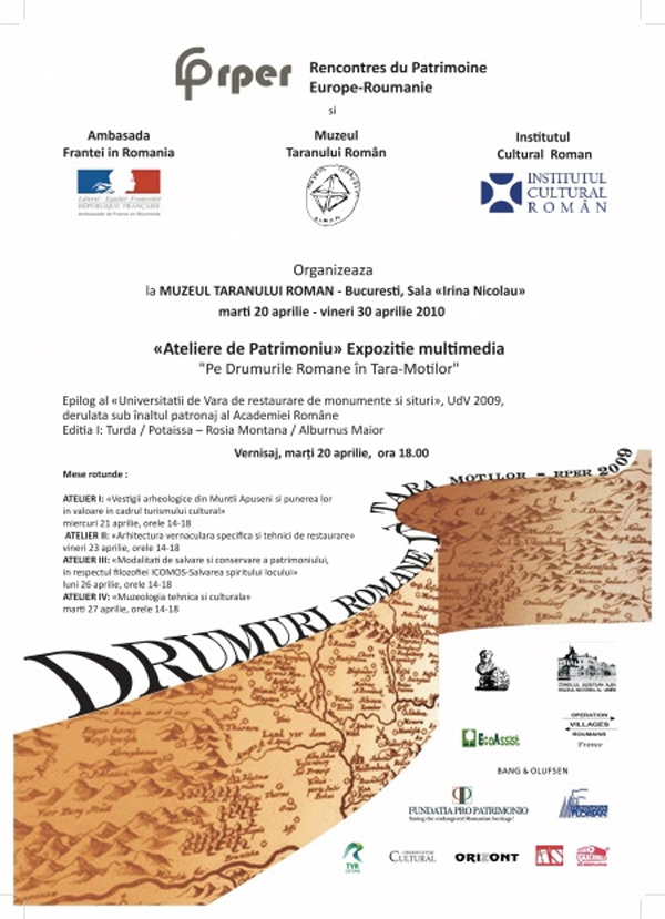 Asociaţiile RPER-Franţa şi RPER-România, în parteneriat cu Ambasada Franţei în România, Muzeul Ţăranului Român şi Institutul Cultural Român organizează în perioada 20-30 aprilie, la Muzeul Ţăranului Român, “ATELIERE DE PATRIMONIU”, epilogul primei ediţii a “Universităţii de Vară de restaurare de monumente şi situri”, UdV 2009, derulate sub înaltul patronaj al Academiei Române (Turda / Potaissa – Roşia Montană / Alburnus Maior).