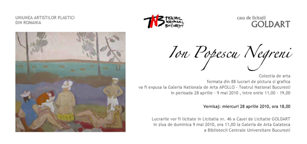 Ion Popescu Negreni care va avea loc miercuri 28 aprilie, ora 18.00, la Galeria APOLLO a Teatrului National.