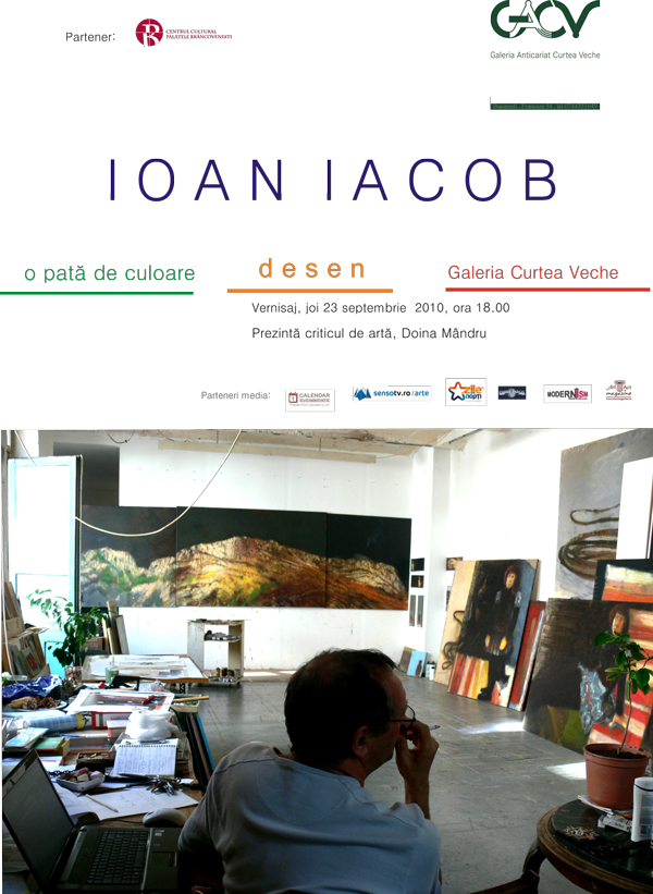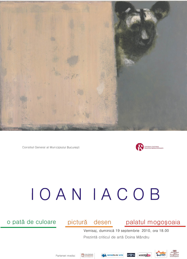 Pată de culoare este titlul sub care expune la palatul Mogoşoaia din 19 septembrie Ioan Iacob, artist transilvănean activ la Düsseldorf din anul 1980, unde, după trei ani de studii la Kunstakademie, în clasa lui Graubner, – ce se vor incheia in 1984 ca asistent al maestrului – primeşte mai multe burse de studii şi un premiu de promovare din partea Fundaţiei Max Ernst. De atunci, Iacob a expus mult şi cu succes în Germania, picturile lui intrînd încă din anii debutului în mari colecţii particulare, dar a fost prezent şi la Sibiu, capitala culturală europeană a anului 2007, cu o expoziţie de mare forţă, prezentată sub sintagma “Întunericul roşu”. Roşul era, cu adevărat, fundalul, motivul, atmosfera, întunericul şi dominanta patetică a acelor remarcabile pânze.