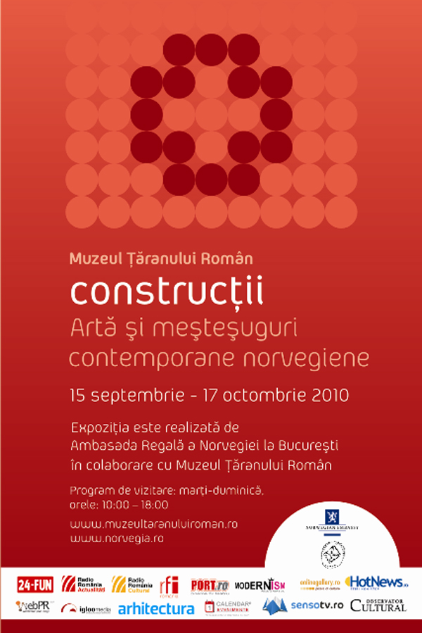 Expoziţia de artă şi meşteşuguri contemporane norvegiene „Construcţii” va fi deschisă la Muzeul Ţăranului Român, sala Irina Nicolau, din Bucureşti, începând cu data de 15 septembrie. Organizată de Ambasada Regală a Norvegiei la Bucureşti în colaborare cu Muzeul Ţăranului Român, expoziţia va fi deschisă în perioada 15 septembrie – 17 octombrie 2010, de marţi până duminică, în intervalul orar 10:00 – 18:00.
