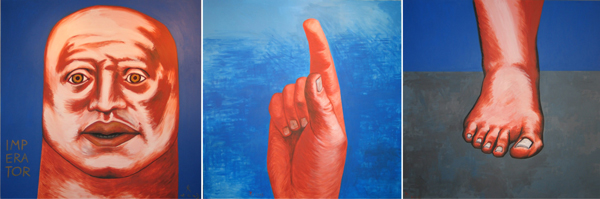 Alexandru Radvan, Cap colosal-Mana colosala-Picior colosa(triptic), acrilic pe pan 600x600cm,