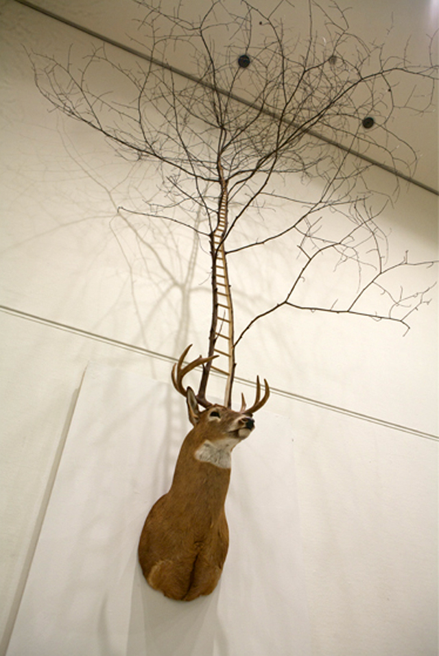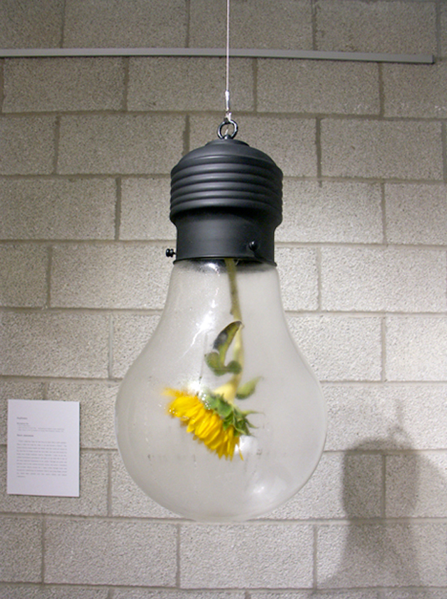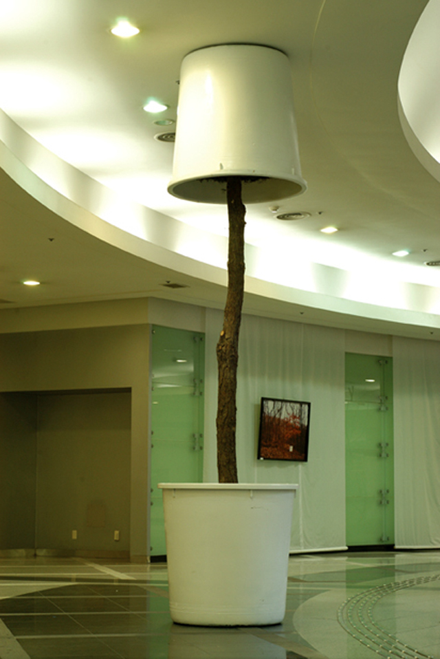 Educated in South Korea and the United States, produces otherworldly installations and sculpture works that juxtapose man-made elements with nature to create surreal dream spaces. Utilising suspension as a common motif, his works are constantly poised in a state of ambiguous wonderment. Within his installations, living things are held inside the fragile confines of light bulbs and helium balloons replace tree foliage, literally uplifting the tree and its roots.