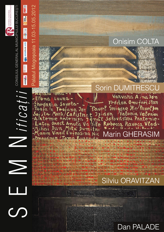 Duminică, 11 martie 2012, ora 16, Centrul Cultural Palatele Brâncoveneşti invită publicul la o incitantă expoziţie despre semn şi reconstrucţie arhetipală în viziunea a cinci remarcabili artişti contemporani. Pe multilple căi Sorin Dumitrescu, Marin Gherasim şi Silviu Oravitzan(şi nu erau singurii) porneau, la jumătatea anilor ’70, pe urmele lui Mircea Eliade ori Petre Ţuţea, sau însoţindu-l pe Nichita Stănescu, la redefinirea relaţiei artistului cu sacrul ca o căutare a centrului, dar şi ca o nevoie de descifrare a temeiurilor lumii şi, implicit, ale artei. Demersul lor avea, în ciuda cenzurii, un larg şi profund ecou în toate mediile artistice. Teatrul lui Marin Sorescu, muzica lui Tiberiu Olah sau ceramica lui Costantin Bulat ţinteau celeaşi esenţe.