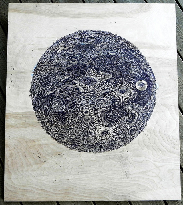 Since 2006 Pittsburgh-based husband and wife Paul Roden and Valerie Lueth have run the Tugboat Printshop, a traditional printmaking studio where everything is made by hand, starting with the giant slabs of wood into which each of their images are carved. The Moon is their largest hand-carved relief print ever coming in at 36″ x 32″ (91 x 82 cm) and will printed using two colors. If you’re interested they documented the process of carving the beautiful illustration which is now available for pre-order, and I also recommend checking out their other prints. (via cloud junky)