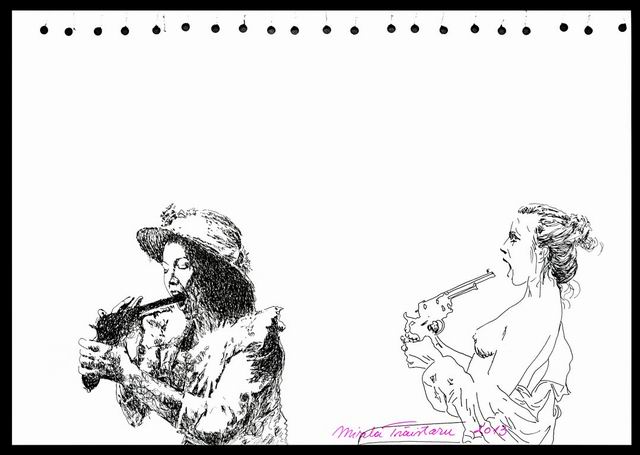Cîte un accesoriu cu aer mai „vechi” (o pălărioară feminină sau una masculină, cu papion) vin dinspre magazia teatrală cu decoruri şi costume, căci seria se intitulează Backstage: ni se fac – aşadar – dezvăluiri din lumea nevăzută de dincolo de spectacolul de pe scenă, artista lucrînd de astă dată cu fotografii „din culise” realizate de regizorul Radu Afrim, pe care-l şi recunoaştem la un moment dat, portretizat după un autoportret combinat cu imaginea unei tinere dezbrăcate şi care ţine ţeava unui pistol în dreptul gurii deschise, parcă nu atît a sinucidere, cît făcînd o aluzie brutal-erotică. Personajele – junele actriţe, junii actori – apar singuri sau în cupluri sau în grupuri cu compoziţii diverse, fără prejudecăţi heterosexuale, dar mereu cu un aer de preocupare pentru aspectul propriu, pentru eleganţă şi atractivitate, ca şi faţă de cealaltă/celălalt/celelalte/ceilalţi, cu tema amoroasă cel puţin implicită. Poziţiile sînt degajate sau mai limpede-provocatoare, chiar tandre ori efectiv-erotice în cîteva secvenţe. Totul – ca exerciţiu de portretistică și ca joc improvizatoric, dovadă mărcile „metanarative” lăsate la vedere: găurile de la cotor ale carnetului de schiţe şi spirala de sîrmă care ține foile laolaltă, deci și ciclul „culiselor”, plus dungile negre care delimitează paginile ca nişte rame. De remarcat şi tehnica aparent simplă şi spontană a artistei, care creionează rapid, cu mină subţire, pe fundaluri lăsate de obicei albe, cu parte dintre contururi trasate „din prima”, din cîte o singură linie, în rest aglomerînd nervuri care creează volume şi umbre, într-o stilistică – pe ansamblu – foarte personală, imediat recognoscibilă. Cîteva imagini poartă şi inscripţii textuale supraadăugate, ca în multe din portretele pictate ale Mirelei Trăistaru, încadraturile negre fiind aici dublate de încă o ramă în ramă, dar cu tuşă de pensulă lată, în roşu, cu trimitere – iarăși – erotică. Şi desenele sînt trasate mai gros, poate cu cărbune şi cu creioane mai moi, impresia fiind de mai mare apropiere de tablourile autoarei, mai ales de cele cu fotomodele feminine, cu care a lucrat mult şi în maniere diverse (de la pictură la costumaţii sau la pictura corporală). În sfîrşit, aş mai nota că multiplele semne autoreflexive şi succesivele „puneri în abis” ale imaginilor ca portrete după fotografii, desene de dinainte sau de după tablouri, spectacol de dincolo de spectacol ş.a.m.d. ne împing şi spre interpretarea seriei ca trimitere către încă un strat, nedezvăluit aici, către adevăratele „culise” ascunse, unde se va desfăşura narațiunea erotică propriu-zisă.