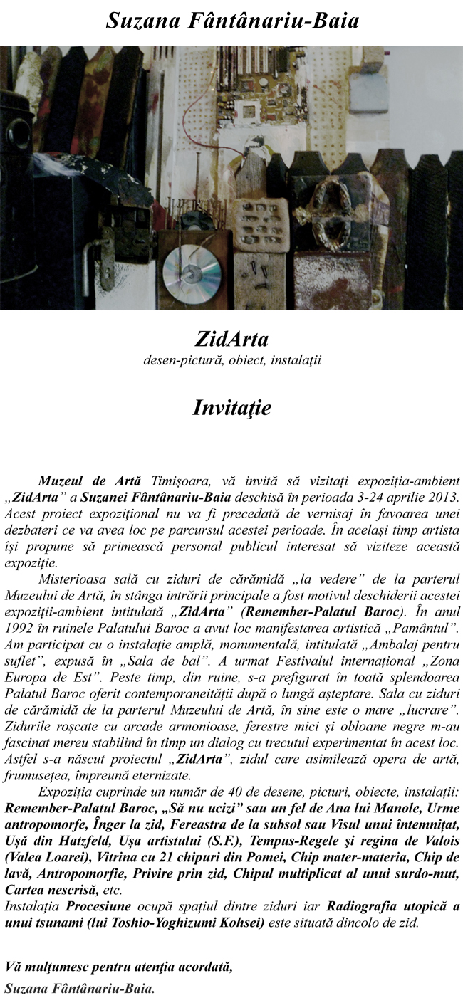 Muzeul de Arta Timisoara va invita sa vizitati expozitia-ambient „ZidArta” a Suzanei Fantanariu-Baia deschisa in perioada 3 -24 aprilie 2013.Acest proiect expozitional nu va fi precedat de vernisaj in favoarea unei dezbateri ce va avea loc pe parcursul acestei perioade. In acelasi timp, artista isi propune sa primeasca personal publicul interesat sa viziteze aceasta expozitie.