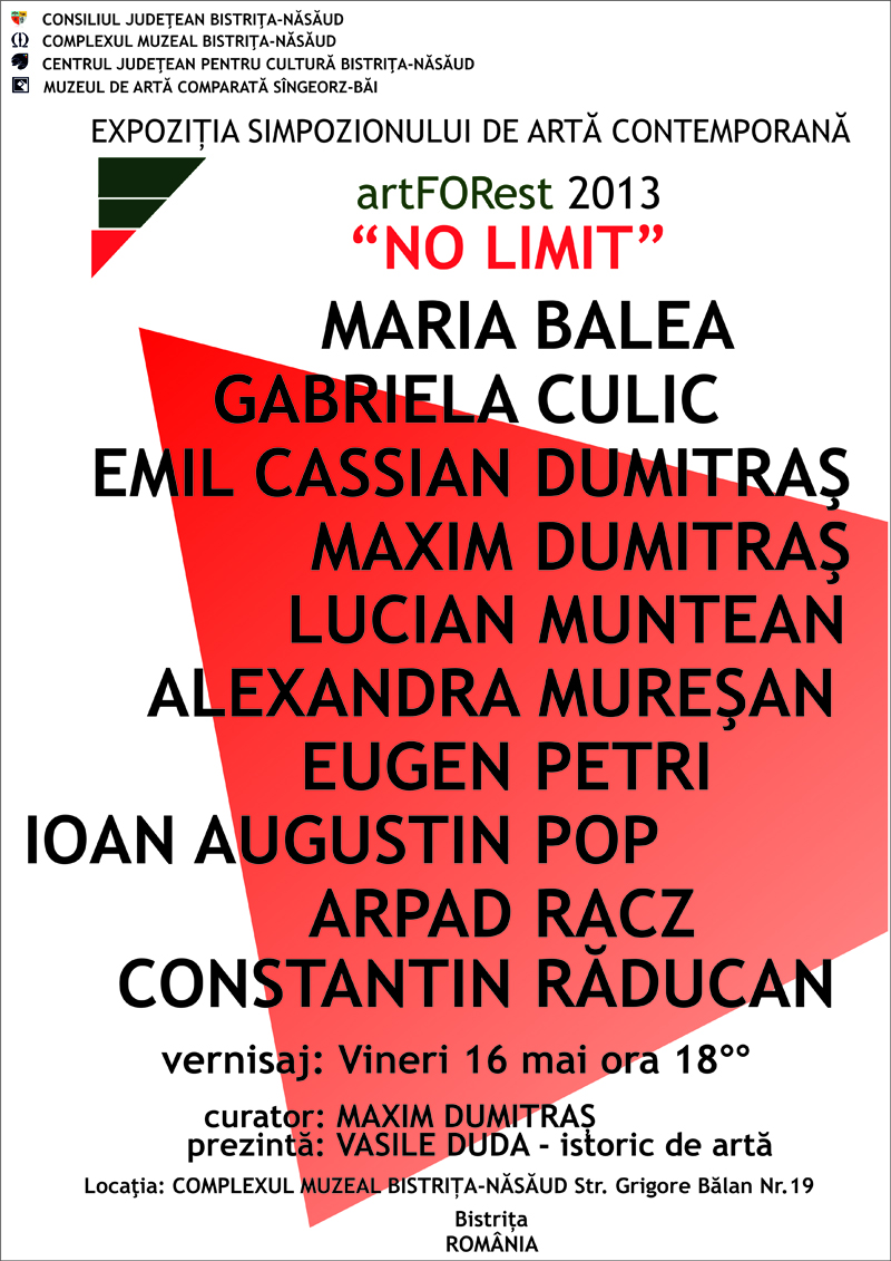 Complexul Muzeal Bistriţa-Năsăud si Muzeul de Artă Comparată Singeorz-Băi, vă invită vineri, 16 mai 2014 la ora 18,00 la vernisajul SIMPOZIONULUI DE ARTĂ CONTEMPORANĂ artFORest 2013 - “NO LIMIT”, la Muzeul Bistriţa, din str.Gen.Grigore Bălan nr.19, în sala “Grigore Bradea”, iar cu acest prilej, propune publicului întâlnirea cu operele de artă a artistilor: : MARIA BALEA – pictură, GABRIELA CULIC – pictură, EMIL CASSIAN DUMITRAȘ – ceramică, MAXIM DUMITRAȘ -sculptură, LUCIAN MUNTEAN – fotografie, ALEXANDRA MUREȘAN – ceramică, EUGEN PETRI – sculptură, IOAN AUGUSTIN POP – pictură, ARPAD RACZ – pictură, CONSTANTIN RADUCAN – pictură