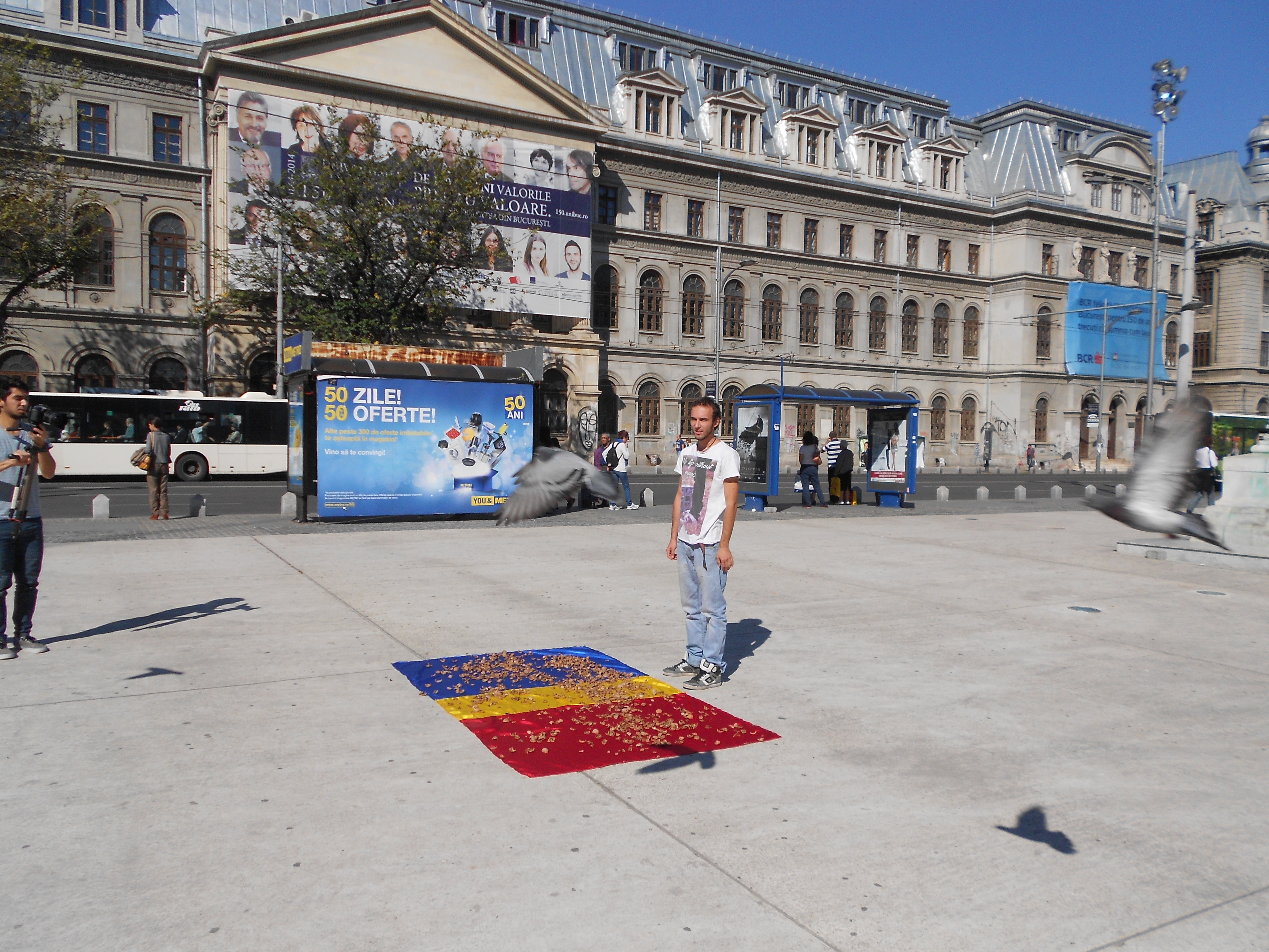 The Romanian flag which consists of the primary colors, lest the original amount of yellow, considerably narrowed intentionally in order to emphasize the “stolen goods” of the nation by it’s own co-nationals. Over the flag I placed nutshells as reference to the medieval punishment for of kneeling on top of them (this was used by monks, but also in the scholastic environment). I transposed this situation of the young Romanian generation over the flag (the punishments, the old overwritten rules and regulations), not as an act of self-pity, more as an act of awakening towards patriotism and self-trust for the struggle to win over the future for the generations to come.