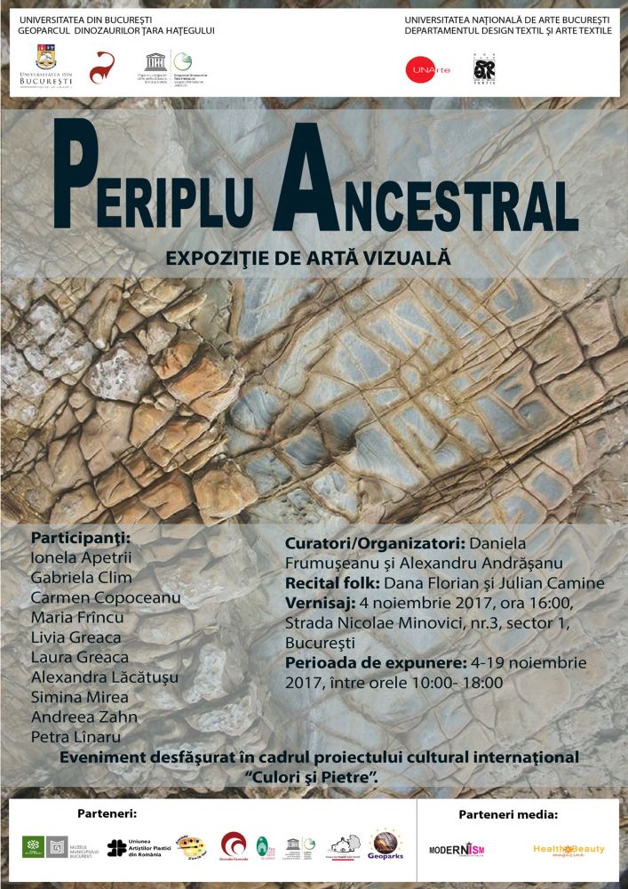 Universitatea din Bucureşti – Geoparcul Dinozaurilor Țara Hațegului și Universitatea Naţională de Arte Bucureşti, în parteneriat cu Muzeul Municipiului București, anunţă vernisajul expoziţiei de artă vizuală PERIPLU ANCESTRAL, care va avea loc sâmbătă 4 noiembrie 2017, ora 16:00, la sala de conferințe a Muzeului Nicolae Minovici, Str. Doctor Nicolae Minovici nr. 1.
