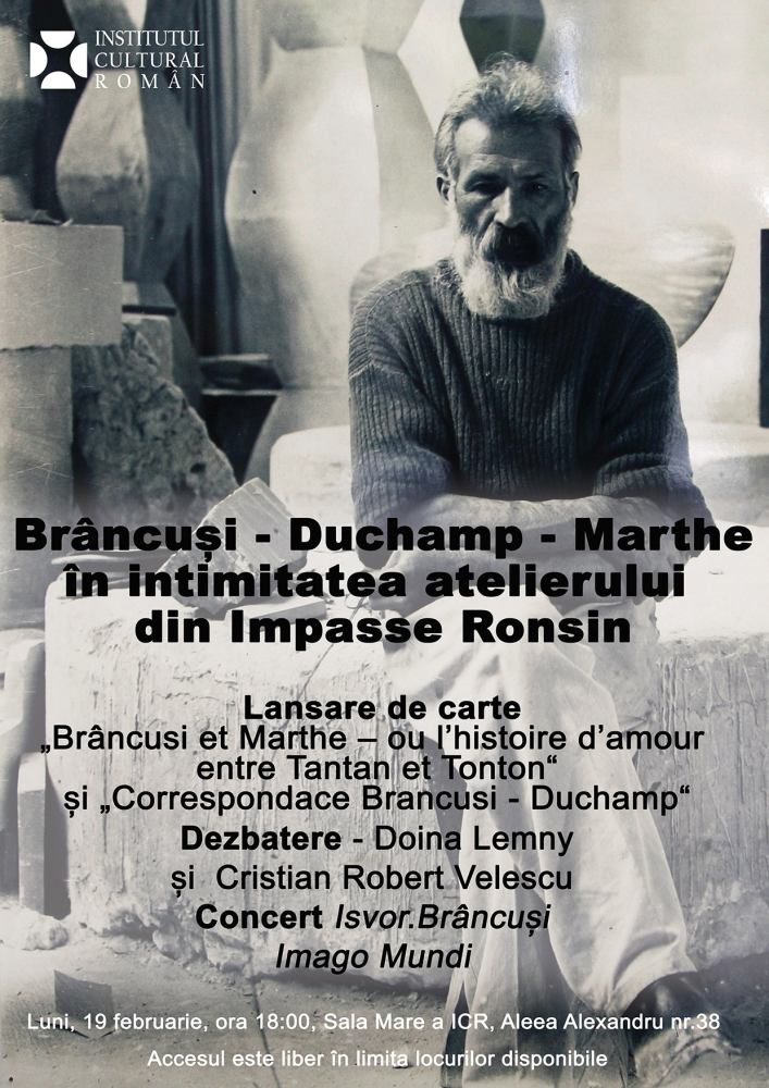 Institutul Cultural Român organizează luni, 19 februarie 2018, de la ora 18.00 evenimentul „Brâncuși – Duchamp – Marthe, în intimitatea atelierului din Impasse Ronsin“, în Sala Mare din Aleea Alexandru nr. 38, București, în cadrul căruia va avea loc lansarea albumelor Brancusi et Marthe – ou l’histoire d’amour entre Tantan et Tonton și Correspondance Brancusi – Duchamp, urmate de o dezbatere între Doina Lemny, editoarea volumelor și de Cristian Robert Velescu, istoric de artă. În încheiere, ansamblul Imago Mundi va susține concertul Isvor – Brancuși.