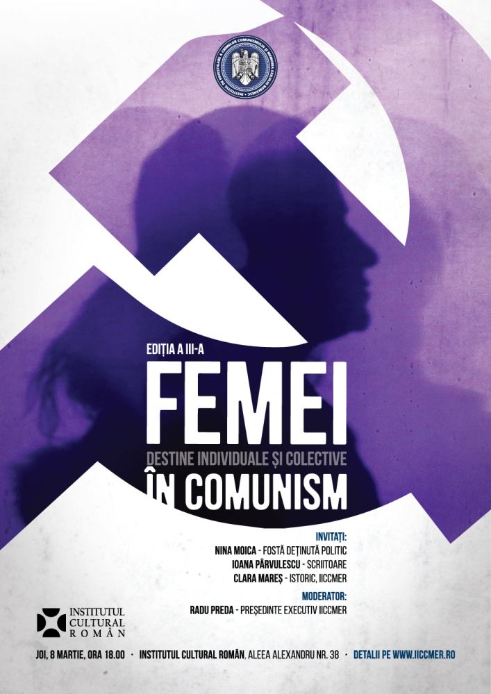 Institutul de Investigare a Crimelor Comunismului şi Memoria Exilului Românesc (IICCMER) și Institutul Cultural Român (ICR) vă invită la evenimentul „Femei în comunism – Destine individuale şi colective” joi, 8 martie 2018, începând cu ora 18.00, la sediul ICR din Aleea Alexandru nr. 38.