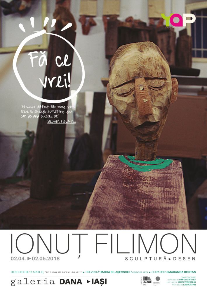 Galeria de artă DANA Iași invită luni, 2 aprilie 2018, orele 18.00, publicul ieșean la deschiderea expoziției de sculptură și desen „Fă ce vrei!” semnată de către IONUȚ FILIMON, student masterand în anul I, specializarea Sculptură din cadrul Facultății de Arte Vizuale și Design – Universitatea Națională de Arte „George Enescu” Iași.