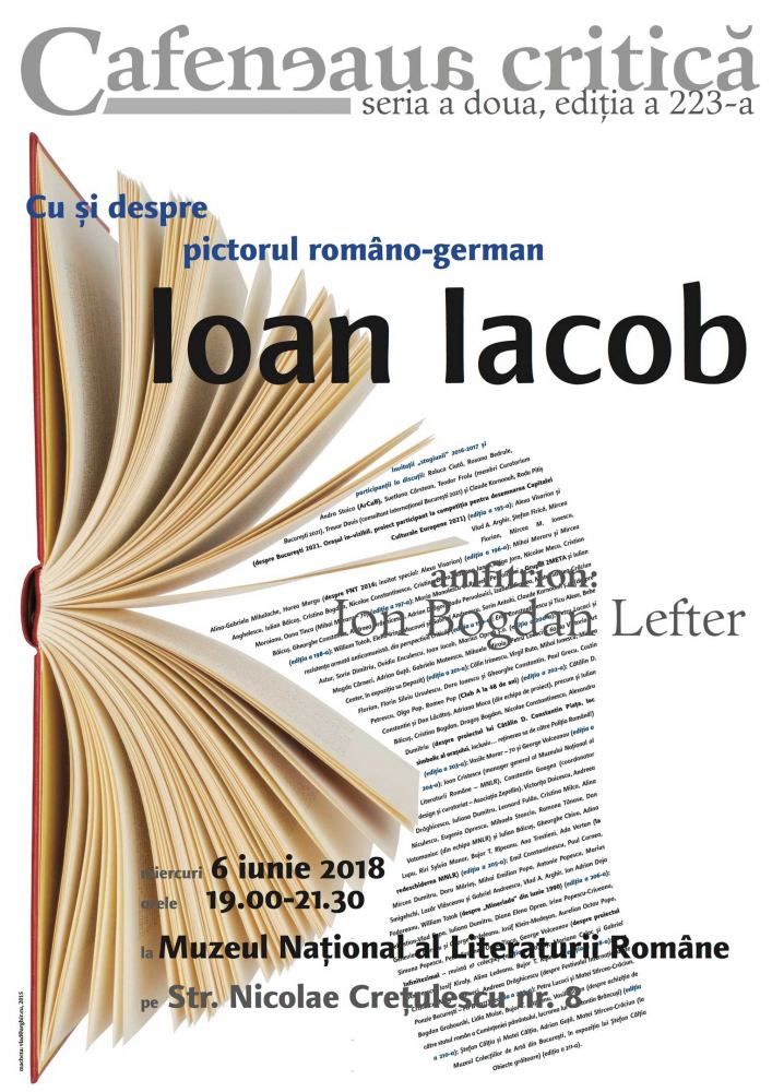 După o pauză în săptămîna Salonului de carte „Bookfest” (30 mai-3 iunie 2018), Cafeneaua critică revine cu o ediţie… plastică: o seară cu şi despre reputatul, subtilul pictor Ioan Iacob, artist român stabilit în Germania. „Navetist” în ultimii ani între cele două culturi, Ioan Iacob a expus sistematic şi în străinătate, şi în ţara sa natală, în Bucureşti şi în alte locuri de pe hartă, în personale sau în proiecte de grup, precum cel intitulat Fig ([Fig(urativ)]), ajuns acum la Fig 3, la Galeriile „Carol” din Capitală (16 mai-31 august 2018).