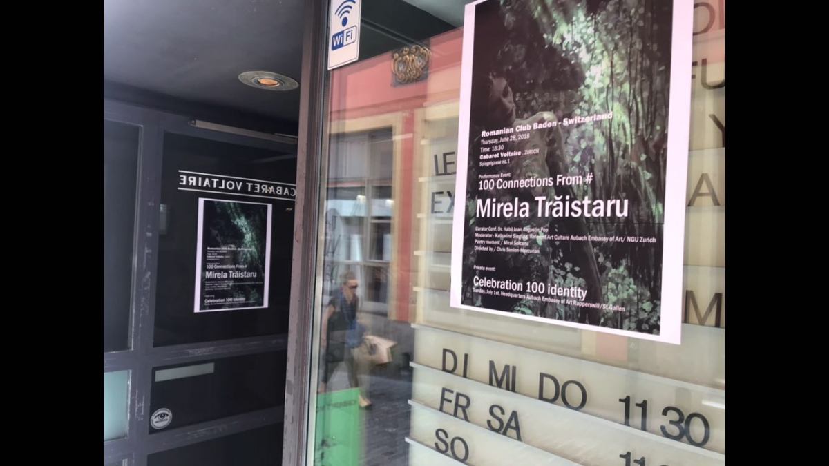 Joi, 28 iunie 2018 la Cabaret Voltaire Zuric, Elvetia, sub patronajul Clubului Romanilor Baden, s-a desfasurat performace-ul “100 conactions from #” sustinut de Mirela Traistaru. Curatorul evenimentului a fost Dr. Habil Ioan Augustin Pop , in deschidere luand cuvantul reprezentanti ai Clubului Romanilor Baden si reprezentanti ai Aubach Embassy of Art.