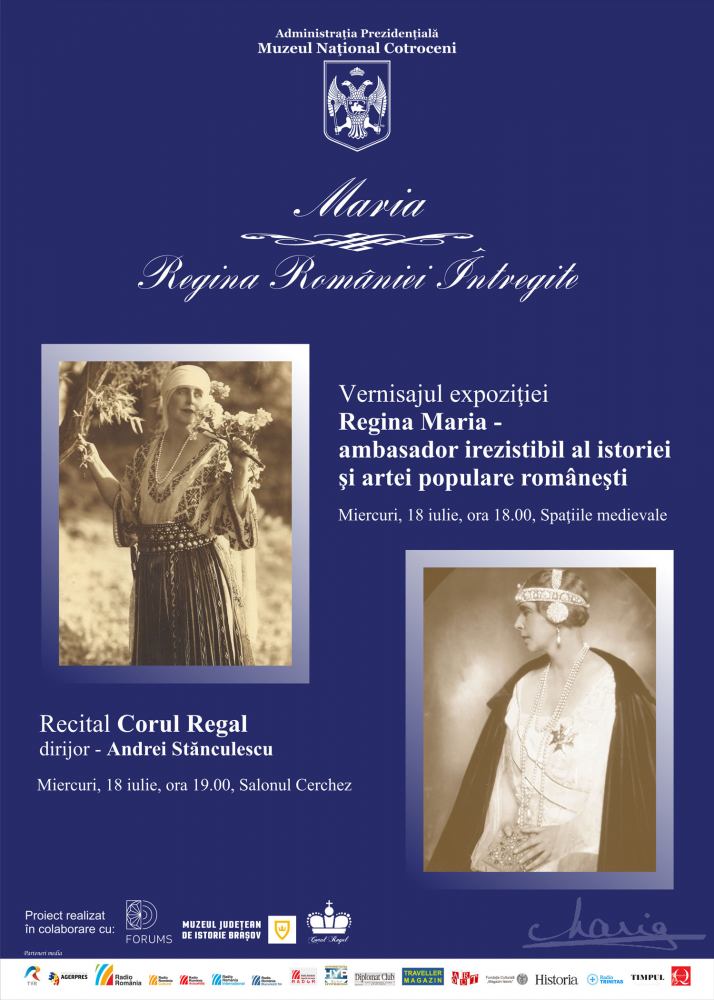 Joi, 18 iulie, publicul este invitat să descopere sau să aprofundeze alte trăsături ale personalității Reginei Maria, care arată, încă o dată, unicitatea sa pe scena istoriei românilor. Astfel, începând cu ora 18.00, în Spațiile Medievale ale muzeului, va avea loc vernisajul expoziției “Regina Maria – ambasador irezistibil al istoriei şi artei populare româneşti”, realizată de asociația Forums, în parteneriat cu Muzeul Județean de Istorie Brașov. Expoziția promovează frumusețea și bogăția tradițiilor și a artei populare românești plecând de la mândria și pasiunea cu care Regina Maria a făcut cunoscute aceste valori culturale autentice atât prin activitatea sa politică, cât și prin opera culturală. Expoziția va fi deschisă spre vizitare în perioada 18 iulie – 19 august a.c.