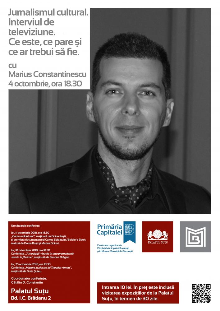 Începând cu data de 4 octombrie se reiau, la Palatul Suțu, Conferințele de joi, în organizarea Muzeului Municipiului București, coordonator fiind Cătălin D. Constantin. Mâine, dezbaterea începe la ora 18.30, titlul acesteia fiind „Jurnalismul cultural. Interviul de televiziune. Ce este, ce pare și ce ar trebui să fie”, susținută de Marius Constantinescu.