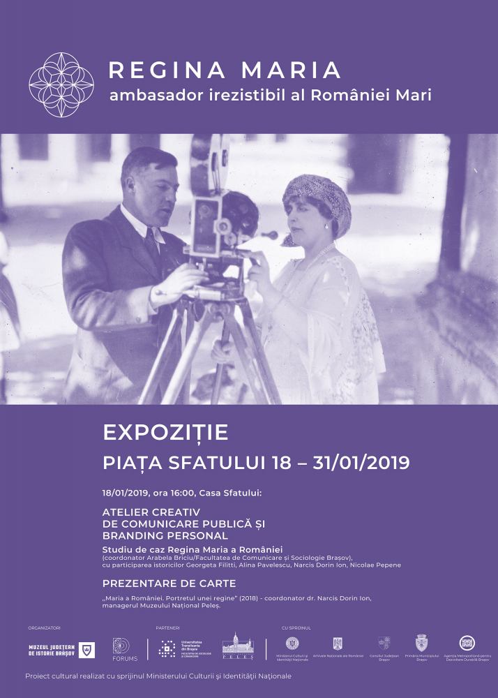 Activitatea externă a Reginei Maria este tematica expoziției outdoor de fotografie istorică, prezentată în Piața Sfatului din Brașov în perioada proiectului (18-31 ianuarie 2019). Expoziția cuprinde o selecție de fotografii istorice din colecțiile Arhivelor Naționale ale României, Bibliotecii Congresului S.U.A., Muzeului Național Peleș și din colecții private.