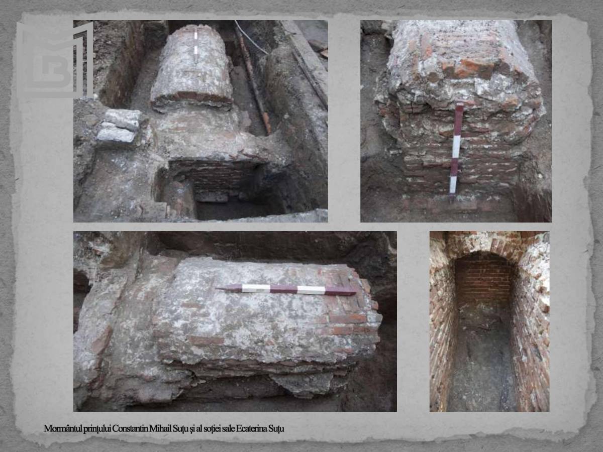 În curtea bisericii a fost realizată o cercetare arheologică de mai mică amploare prilejuită de strămutarea monumentului funerar al prințului Constantin Mihail Suțu (d.1869), fiul domnitorului Moldovei Mihail al II-lea Suțu (domnie 1819-1821) și al soției sale Ecaterina Suțu (d. 1873). Astfel, s-a putut cerceta cripta realizată din cărămizi legate cu mortar în care se aflau rămășițele celor doi soți decedați în perioade diferite. Primul înhumat în criptă a fost Constantin Mihail Suțu (ofițer în armata greacă), patru ani mai târziu fiind urmat de soția sa Ecaterina. S-a putut observa o refacere a bolții criptei prilejuită cel mai probabil de cea de-a doua înmormântare. Interesant este faptul că deși s-au păstrat lemnele și elementele decorative de la sicrie, elemente din rochia de mătase a prințesei și din fracul prințului au fost extrem de degradate și imposibil de recuperat. Singurele piese de inventar descoperite au fost verighetele celor doi, aflate în prezent la restaurare, a ei din aur cu numele soțului inscripționat, iar a lui din argint.