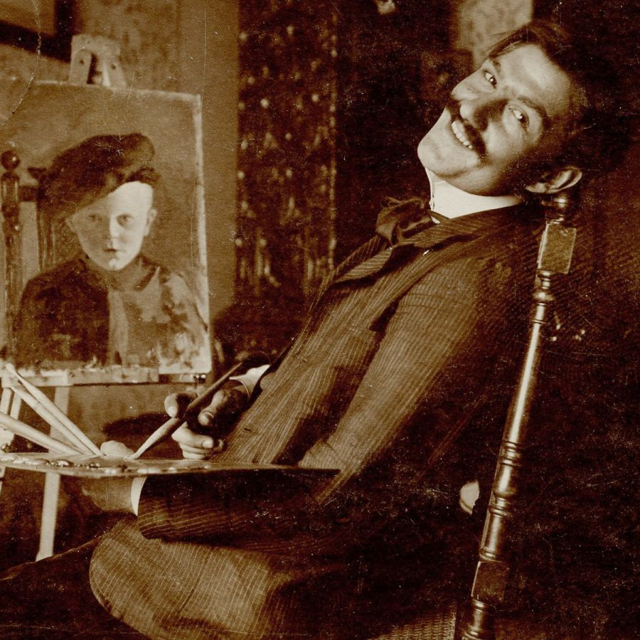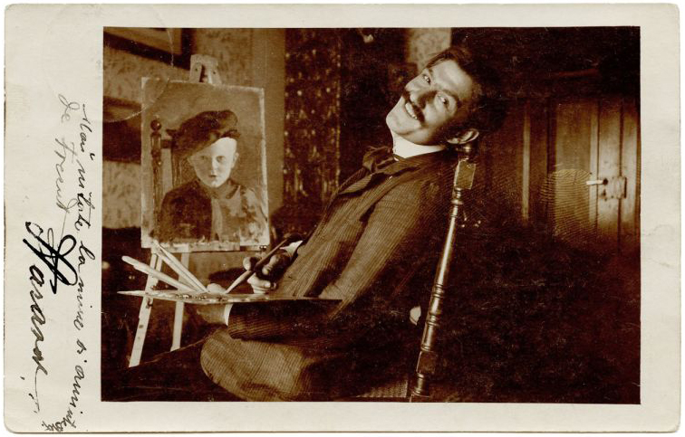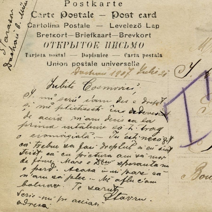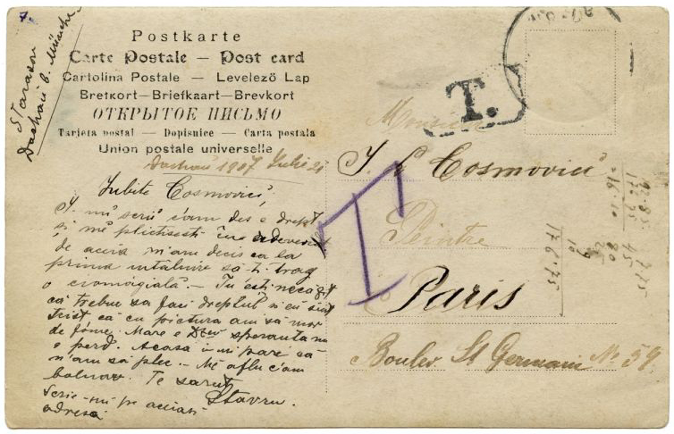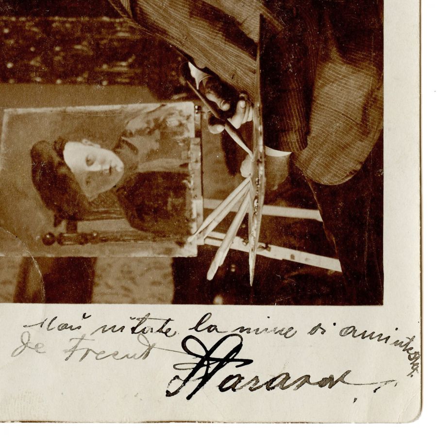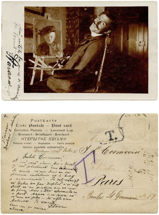 Carte poștală fotografică realizată la Munchen cu portretul artistului Stavru Tarasov la șevalet. Aceasta este trimisă de către Tarasov prietenului său, pictorul Ioan Cosmovici, în Paris, în anul 1907. Cartea poștală este dublu semnată, atât pe recto, cât și pe verso. Foto & text courtesy: Historic