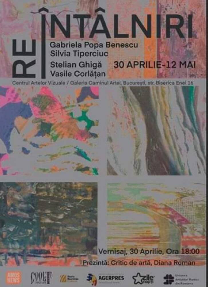 Duminică 30 aprilie, la Centrul Artelor Vizuale – Galeria Căminul Artei din București (str. Biserica Enei 16), areloc de la ora 18 vernisajul expoziției ReÎntâlniri. Până pe 12 mai expun artiștii: Gabriela Popa Benescu, Silvia Tiperciuc, Stelian Ghigă și Vasile Corlățan. Prezintă criticul de artă Diana Roman.