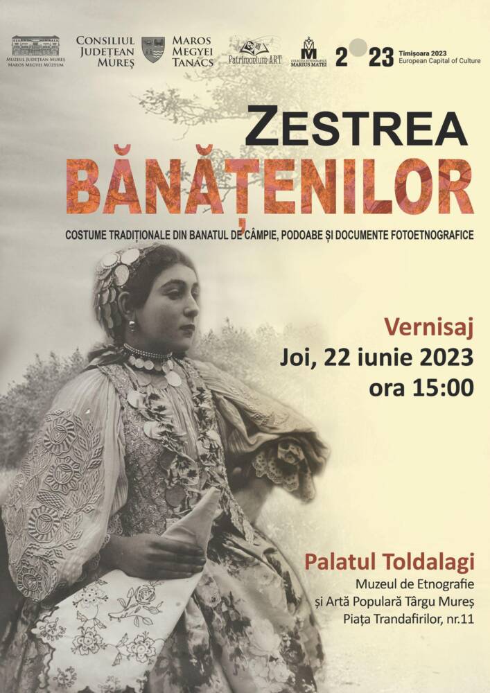 Secția de Etnografie și Artă Populară din cadrul Muzeului Județean Mureș vă invită, joi, 22 iunie 2023, ora 15:00, la vernisajul expoziției „Zestrea bănățenilor. Costume tradiţionale din Banatul de Câmpie, podoabe şi documente etnografice”. În cadrul acestei expoziții etnografice veți putea admira costume tradiționale din Banatul de câmpie, bijuterii și documente fotoetnografice din Colecția etnografică Marius Matei.