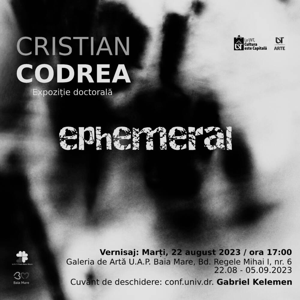 Ephemeral, expoziţie doctorală Cristian Codrea, la Galeria de Artă UAP. Marţi, 22 august, începând cu ora 17.00, Iubitori ai artelor, Galeria de Artă UAP Baia Mare găzduieşte deschiderea expoziției Ephemeral și vernisajul artistului plastic Cristian Răzvan Codrea. Cuvântul de deschidere va fi rostit de conf. univ. dr. Gabriel Kelemen.