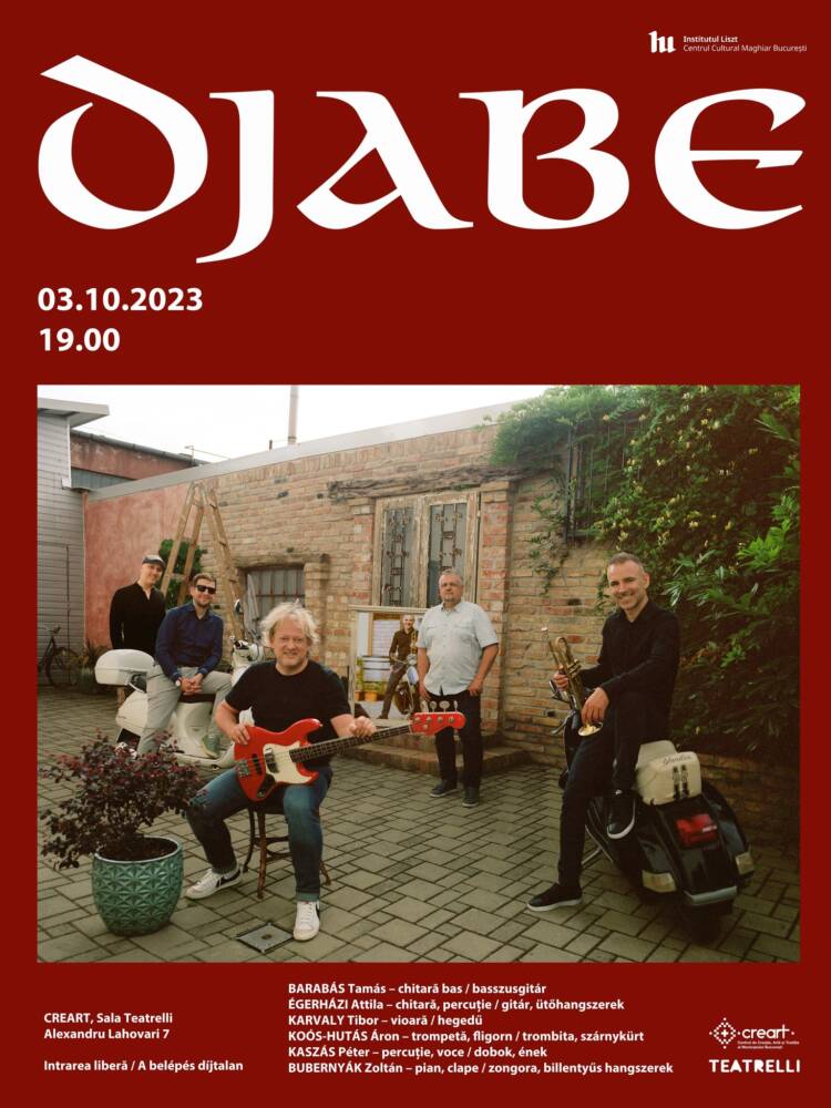 Marți, 3 octombrie începând cu ora 19.00, în deschiderea ediției a V-a a Zilelor Jazzului Maghiar la București, pe scena sălii Teatrelli, CREART va evolua formația Djabe, care în decursul celor 25 de ani de existență a devenit vârful muzicii fusion jazz/world din Ungaria. Trupa care la Festivalul de Jazz de la Gărâna a strâns 13 000 de spectatori, avându-l invitat pe Steve Hackett, cântă o muzică unică în care jazzul este piperat cu diferite elemente ale muzicii tradiționale maghiare și mondiale. Membrii formației sunt: Barabás Tamás – chitară bas, Égerházi Attila – chitară, Kaszás Péter – tobe, Koós-Hutás András – trompetă, Bubenyák Zoltán – clape, Karvaly Tibor – vioară.