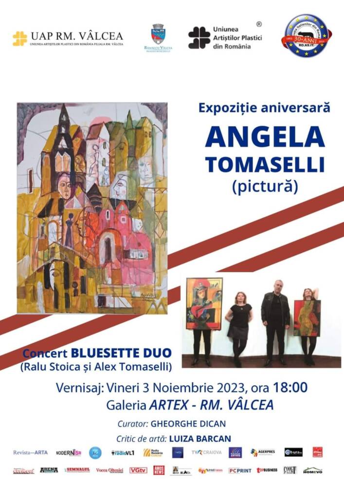 Vineri 3 noiembrie, la ora 18, va debuta la Galeria Artex din Râmnicu Vâlcea vernisajul expoziției aniversare a artistei Angela Tomaselli. Curator este Gheorghe Dican, iar critic de artă – Luiza Barcan.