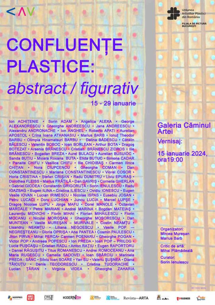 Sub egida Zilei Culturii Naționale, luni, 15 ianuarie 2024, ora 19, va avea loc la Galeria Căminul Artei (Centrul Artelor Vizuale), vernisajul expoziției “Confluențe plastice: abstract / figurativ”, eveniment propus de Filiala de Pictură București a Uniunii Artiștilor Plastici prin Marius Barb și Mircea Mureșan – organizatori, Sorin Ienulescu – curator și Mihai Plămădeală – critic de artă.