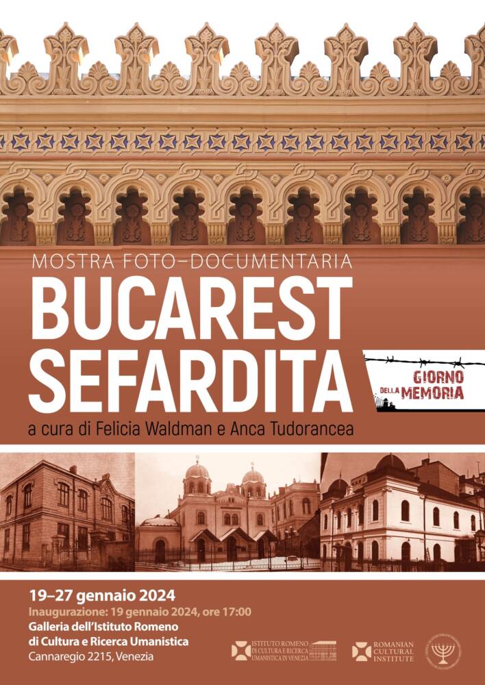 Cu prilejul Zilei Internaţionale de Comemorare a Victimelor Holocaustului, Institutul Român de Cultură şi Cercetare Umanistică de la Veneţia şi Centrul de Studii Ebraice „Goldstein Goren” din cadrul Facultăţii de Litere a Universităţii din Bucureşti organizează Expoziţia foto–documentară „Bucureştiul sefard”, realizată de Felicia Waldman şi Anca Tudorancea, care va fi deschisă publicului în perioada 19–27 ianuarie 2024 în Galeria Institutului. Expoziţia cuprinde un parcurs tematic al istoriei seculare a comunităţii sefarde din Bucureşti: edificii private şi personalităţi ale comunităţii, edificii comunitare, sinagogi, profesii liberale, meşteşuguri, negustori, bănci şi bancheri, medici, personalităţi culturale, editori şi librari, emigraţia sefardă. Fotografii utilizate provin din Arhiva Centrului pentru Studiul Istoriei Evreilor din România, CENTROPA (interviu Dan Mizrahy, 2005), arhiva personală Anca Halfon Mircea, Alberto Modiano, Ovidiu Morar, Felicia Waldman, Anca Tudorancea, Irina Cajal Marin, Sorin Berman, arhiva NMP. Grafică & DTP: Irina Weiner–Spirescu.