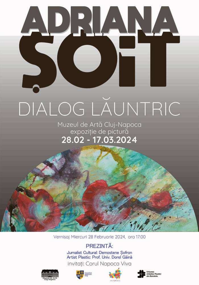 Muzeul de Artă Cluj-Napoca (MACN), instituție publică de cultură care funcționează sub autoritatea Consiliului Județean Cluj, vă invită să vizitați, în perioada 28 februarie – 17 martie 2024, expoziția personală a artistei Adriana Șoit, „Dialog lăuntric”. Vernisajul va avea loc miercuri, 28 februarie 2024, de la ora 17:00, în prezența artistei și a invitaților săi, prof. univ. dr. Dorel Găină și Demostene Șofron, jurnalist cultural. Evenimentul va fi urmat de un moment artistic, asigurat de membrii Corului Napoca Viva.