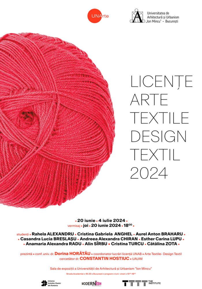 Expoziția Licențe Arte Textile – Design Textil 2024 este deschisă în perioada 20.06 – 04.07.2024 și poate fi vizitată de Luni până Vineri, între orele 10:00 – 16:00.