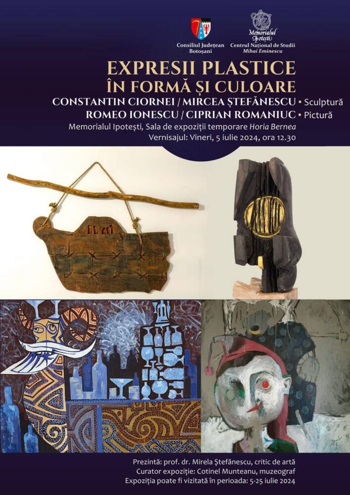În perioada 5 – 25 iulie 2024 la Memorialul Ipotești – Centrul Național de Studii ,,Mihai Eminescu” va fi deschisă expoziția de pictură și sculptură Expresii plastice în formă și culoare ce reunește o serie de lucrări realizate de patru artiști ieșeni: Mircea Ștefănescu, Constantin Ciornei, Ciprian Romaniuc și Romeo Ionescu. Artiștii expozanți sunt absolvenți ai Facultății de Arte Vizuale și Design din cadrul Universității Naționale de Arte „George Enescu” din Iași, membri ai Uniunii Artiștilor Plastici din România, filiala Iași, activând pe scena artistică națională de peste 30 de ani. Activitatea artistică și de cercetare a autorilor este materializată prin numeroase participări la expoziții de arte vizuale colective, simpozioane sau conferințe de specialitate, din țară și din străinătate, dar și prin expozițiile personale pe care le-au realizat de-a lungul carierei profesionale.