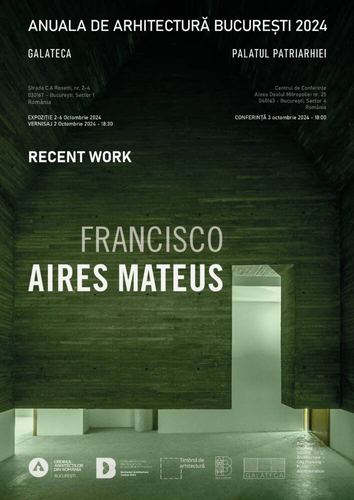 Filiala București a Ordinului Arhitecților din România organizează în cadrul Anualei de Arhitectură București 2024 și al Summitului Capitalelor Europene conferința publică susținută de Francisco Aires Mateusce va avea loc joi, pe data de 3 octombrie 2024 la București, ora 18:00, la Centrul de Conferinte din cadrul Palatului Patriarhiei. Este pentru prima dată când marele arhitect portughez vizitează Romania și susține o conferința publică.