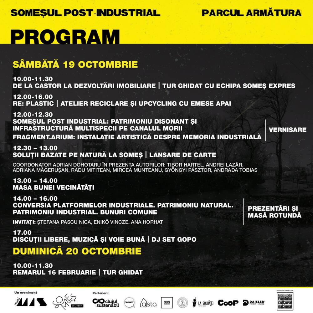 Accesul este gratuit, iar participanții vor avea ocazia să discute despre impactul urbanizării rapide asupra patrimoniului local industrial și natural și să exploreze soluții pentru protejarea acestuia. Printr-un program divers, Someșul Post Industrial propune o întâlnire între trecutul industrial al Clujului și viitorul său urbanistic, cu activități participative, dar și educative. Mai multe detalii despre activitățile din program găsiți pe www.somesdelivery.ro