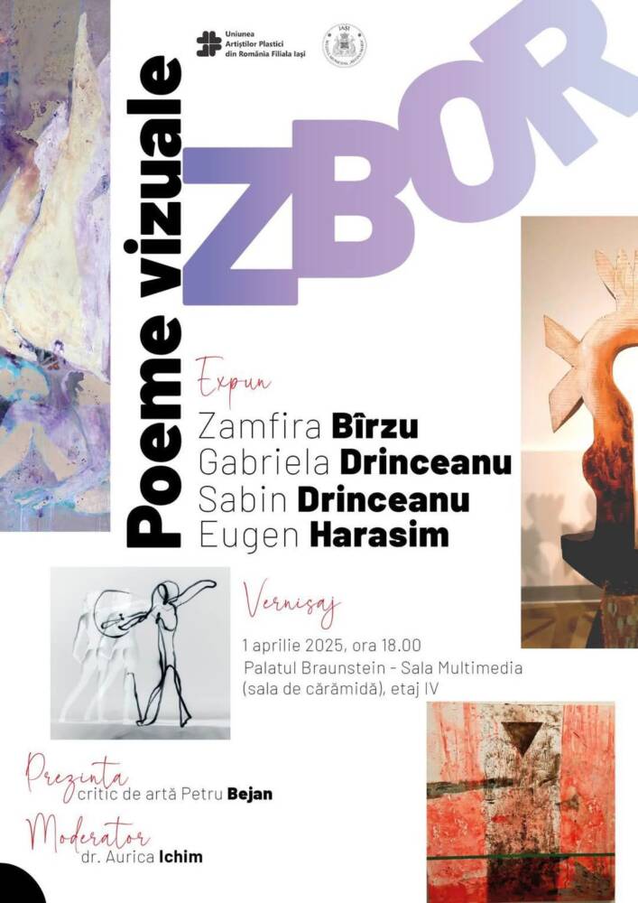 Marți, 1 aprilie, la ora 18, în sala sala multimedia a Palatului Braunstein din Iași va avea loc vernisajul expoziției “Zbor – poeme vizuale”. Expun artiștii: Zamfira Bîrzu, Gabriela Drinceanu, Sabin Drinceanu și Eugen Harasim.