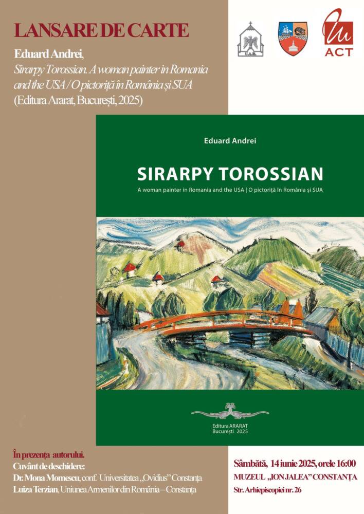 Sâmbătă, 14 iunie 2025, începând cu orele 16.00, Muzeul „Ion Jalea” din Constanța găzduiește lansarea volumului„Sirarpy Torossian. A woman painter in Romania and the USA / O pictoriță în România și SUA”(Editura Ararat, București, 2025), semnat de dr. Eduard Andrei, istoric și critic de artă. Lansarea va avea loc în prezența autorului, iar în deschidere vor lua cuvântul dr. Mona Momescu, conferențiar la Universitatea „Ovidius” Constanța, Facultatea de Litere, și Luiza Terzian, din partea Uniunii Armenilor din România – filiala Constanța. Evenimentul are loc cu sprijinul Consiliului Județean Constanța, Muzeului de Artă Constanța și Uniunii Armenilor din România.