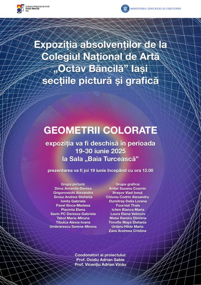 Uniunea Artiștilor Plastici din România Filiala Iași și Centrul Internațional de Artă Contemporană – Baia Turcească din Iași au plăcerea de a vă invită la expoziția absolvenților de la Colegiul Național de Artă „Octav Băncilă” lași secțiile pictură și grafică intitulată „GEOMETRII COLORATE”