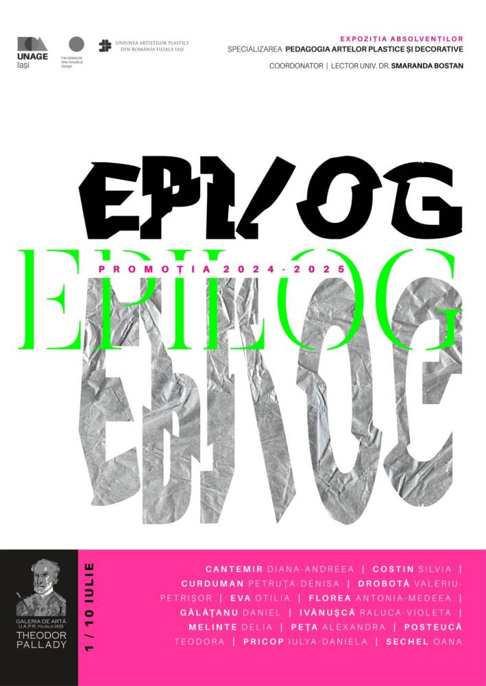 Uniunea Artiştilor Plastici Din România – Filiala Iaşi și Universitatea Națională de Arte „George Enescu” Iași – Facultatea de Arte Vizuale și Design au plăcerea de a vă invita la expoziția semnată de absolvenții specializării Pedagogia artelor plastice și decorative – promoția 2024 – 2025, intitulată „EPILOG”