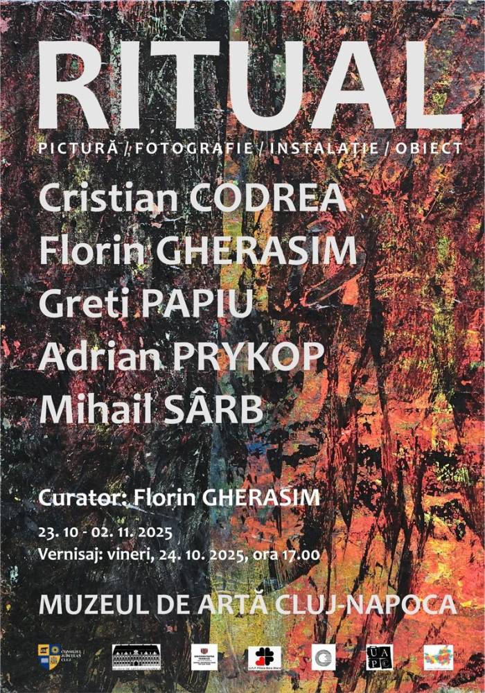 Muzeul de Artă Cluj-Napoca, instituție publică de interes județean, care funcționează sub autoritatea Consiliului Județean Cluj, vă invită să vizitați, în perioada 23 octombrie – 2 noiembrie 2025, expoziția de grup Ritual (pictură, fotografie, instalație, obiect). Vernisajul va avea loc vineri, 24 octombrie, de la ora 17:00, în prezența artiștilor implicați în proiect: Cristian Codrea, Florin Gherasim, Greti Adrienne Papiu, Adrian Prykop, Mihail Sârb. Curator: Florin Gherasim, muzeograf, antropolog, artist vizual.