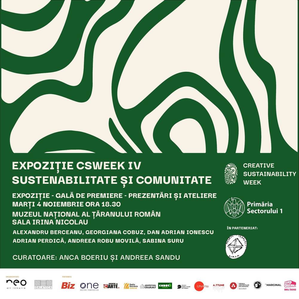 Cea de-a patra ediție a CSWeek – Săptămâna Sustenabilității Creative continuă marți, 4 noiembrie 2025, cu vernisajul expoziției intitulate „Comunitate și sustenabilitate”, prezentări și workshopuri, precum și gala de premiere a participanților, tineri, creatori și organizații non-profit din Sectorul 1 care au răspuns la programul nostru dedicat promovării inițiativelor verzi și sustenabile, transformând experiența lor într-un exemplu pentru viitor. Evenimentul este organizat la Muzeul Național al Țăranului Român, Șoseaua Kiseleff nr. 3, sala Irina Nicolau, începând cu ora 18.30, de Asociația NeoArt România și Galateca, finanțat de Primăria Sectorului 1.