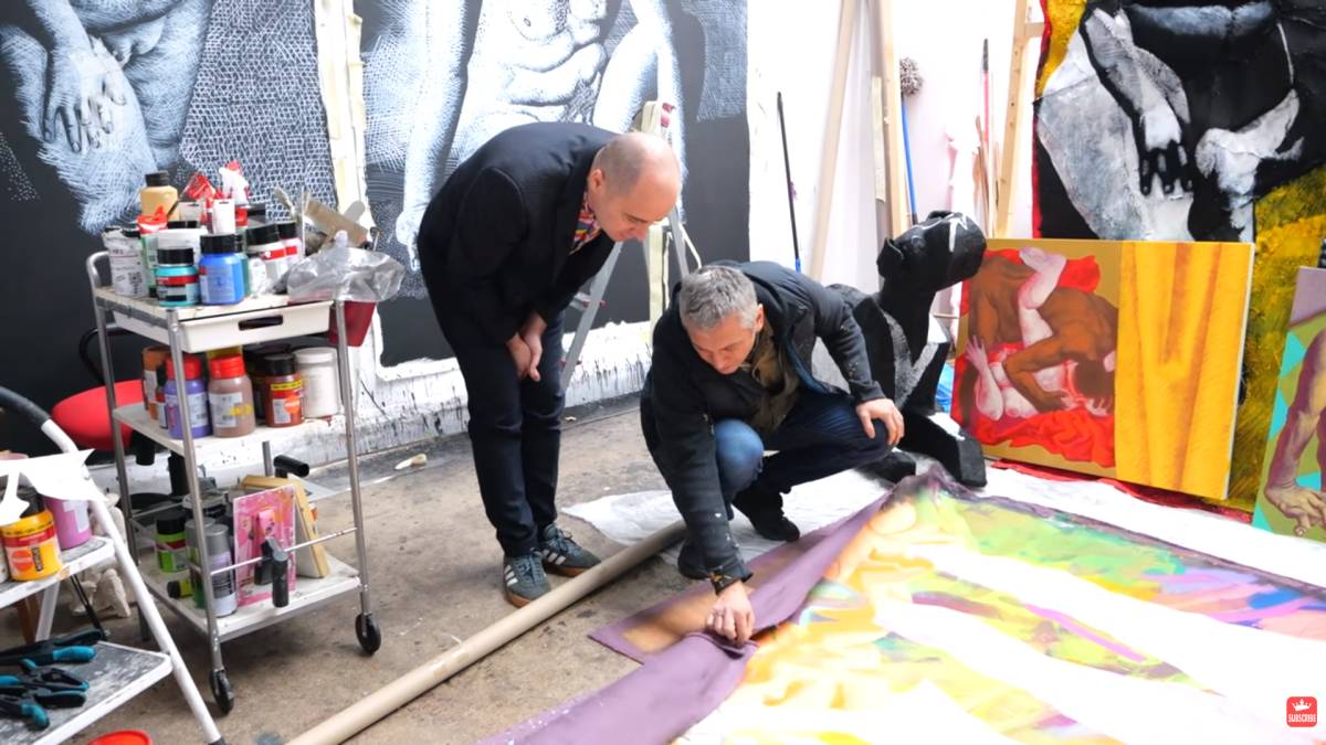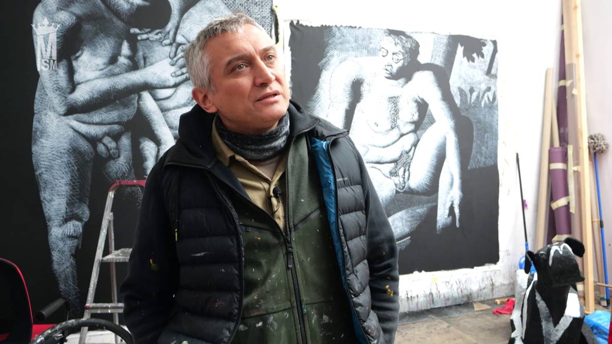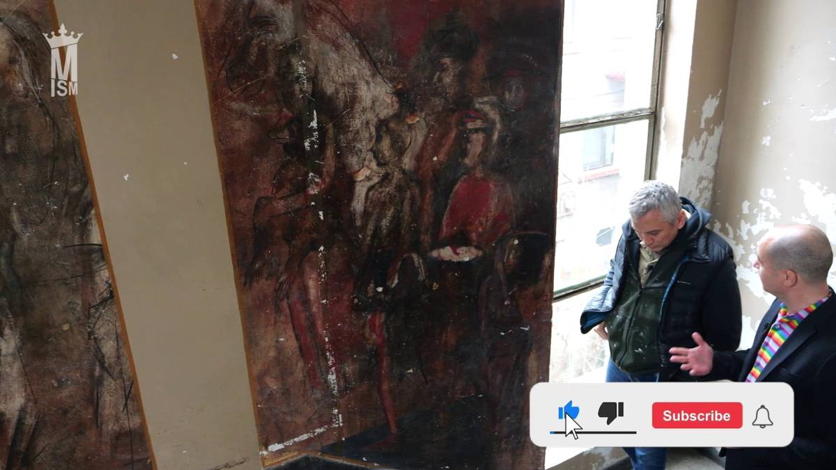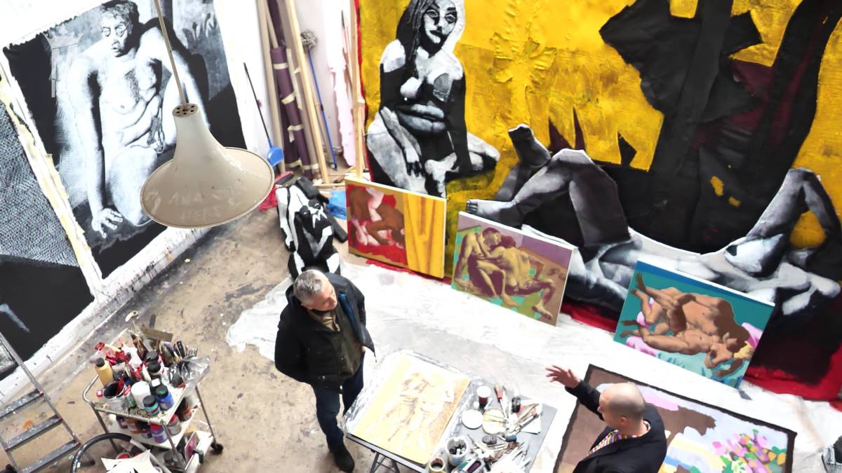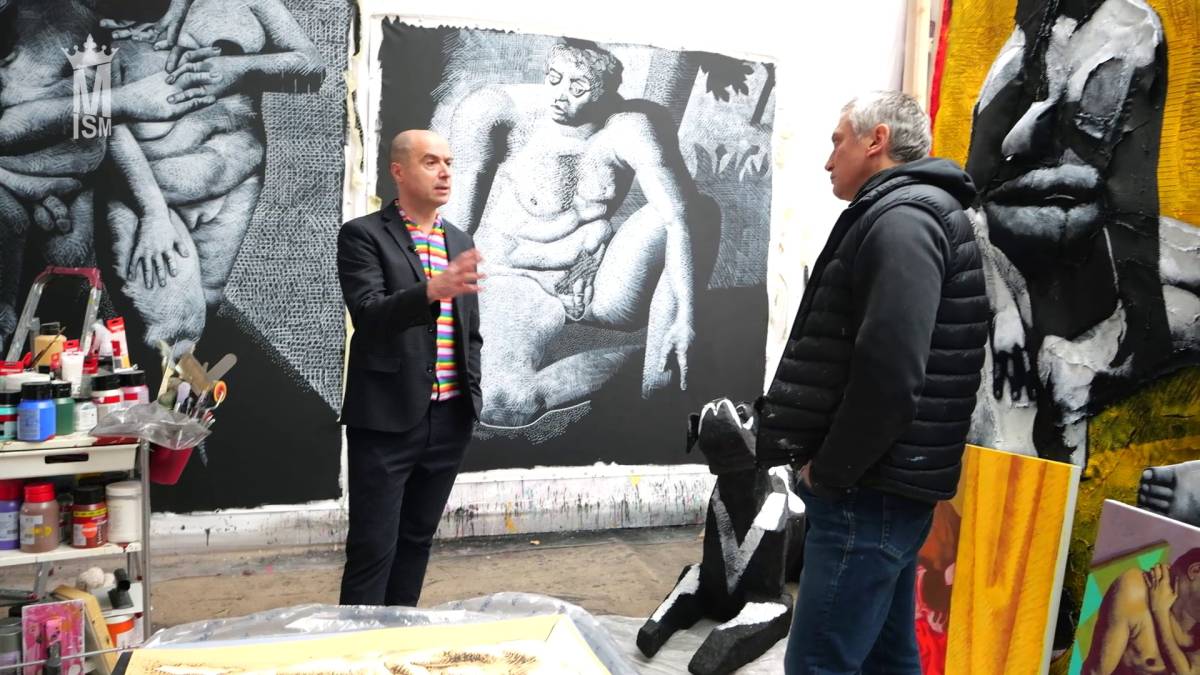Conversația începe pe scara atelierului din Pangrati, un spațiu încărcat de istorie artistică. Atelierul a aparținut inițial lui Corneliu Baba, apoi lui Henry Mavrodin, elevul său. Pe pereții scării se păstrează picturi murale realizate în ulei de foștii studenți ai lui Baba din anii ’70 – Sorin Ilfoveanu, Sorin Dumitrescu, Ștefan Câlția, Mișu Cizmaru. Lucrările au aproape 50 de ani și s-au păstrat remarcabil de bine, ceea ce spune ceva despre tehnica și calitatea execuției. Atelierele au fost construite la mijlocul anilor ’60, iar Baba a fost primul ocupant al acestui spațiu.