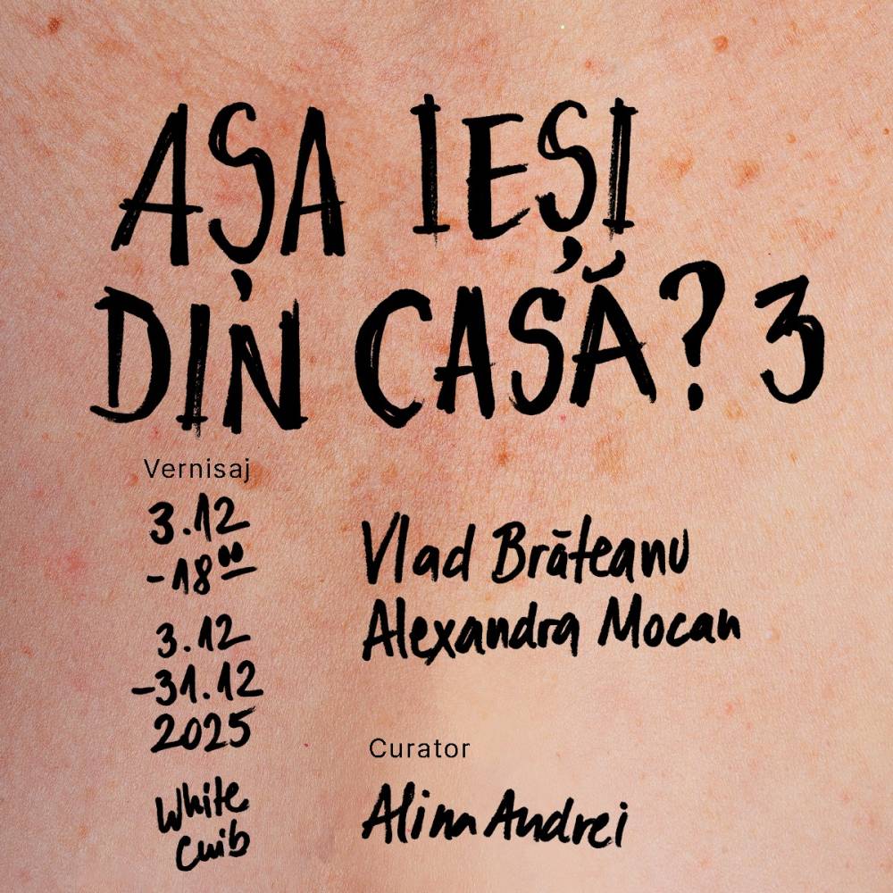 Intitulată „Așa ieși din casă? 3”, expoziția reunește lucrări ale artiștilor Vlad Brăteanu și Alexandra Mocan și continuă să investigheze felul în care hainele funcționează ca indicatori ai identității, dar și ca instrumente de poziționare socială și politică: „Cum ar trebui să se îmbrace oamenii? Ce alegi să porți pe tine și în tine? Sunt întrebări care țin mai puțin de estetică și mai mult de dimensiunile sociale, politice și morale ale societății. Hainele poartă mesaje, explicite sau subtile. Prin lucrările lor, artiștii propun o radiografie a lumii noastre – așa cum este ea acum sau așa cum ar vrea să fie.”- menționează Alina Andrei, curatoarea expozițiilor.