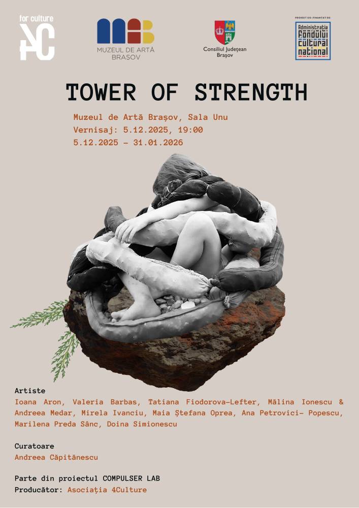 Tower of Strength, parte a proiectului Compulser Lab inițiat de Asociația 4Culture, reunește artiste din România și Republica Moldova într-un demers care investighează relația dintre memorie, corporalitate și reprezentare într-un moment istoric marcat de instabilitate și transformare. Expoziția activează ceea ce Donna Haraway numește „cunoaștere situată”— o înțelegere a lumii din interiorul propriilor experiențe, contexte și vulnerabilități, în care subiectivitatea devine resursă critică și formă de reziliență.